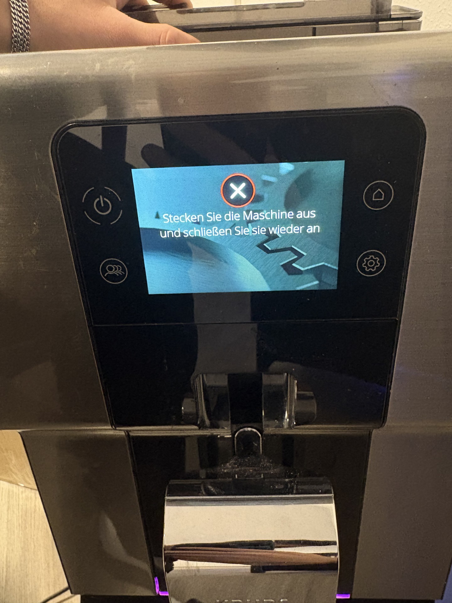 Sobald ich das Netzkabel einstecke, erscheint sofort die Meldung „Entkalken durch Stromausfall unterbrochen“. Wenn ich auf Fortfahren gehe, kommt kurz Spülen, aber nach etwa 3 bis 5 Sekunden bricht alles ab und es erscheint: „Stecken Sie die Maschine aus und schließen Sie sie wieder an“.
